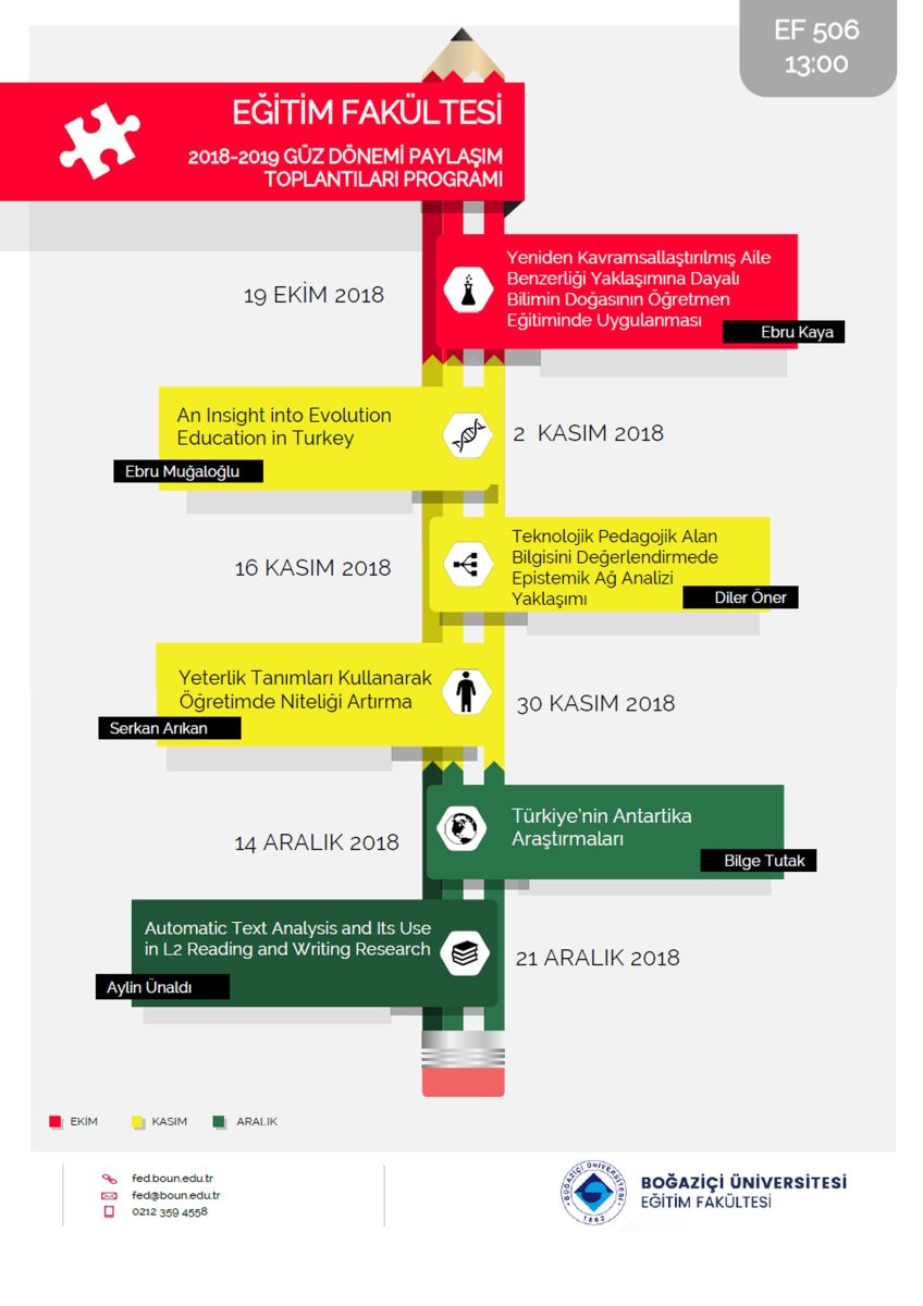 Faculty of Education Fall 2018-2019 Faculty Seminars will be starting with Assoc. Dr. Ebru Kaya's work titled "Yeniden Kavramsallaştırılmış Aile Benzerliği Yaklaşımına Dayalı Bilimin Doğasının Öğretmen Eğitiminde Uygulanması" on October 19, 2018. The language of the presentation will be Turkish, and it will be held at EF 506 at 13:00 pm.