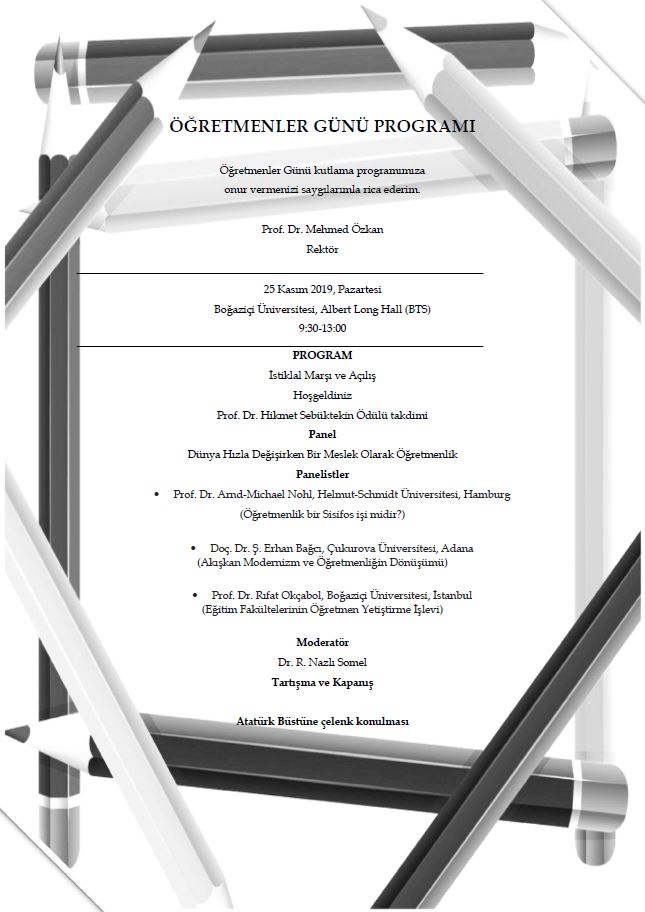 Boğaziçi Üniversitesi Eğitim Fakültesi tarafından her yıl düzenlenen 24 Kasım Öğretmenler Günü Programına erişmek için tıklayınız.