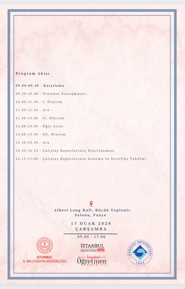 17/01/2024 Çarşamba günü Boğaziçi Üniversitesi’nde, İstanbul İl Milli Eğitim Müdürlüğü ve Eğitim Fakültesi, Yabancı Diller Eğitimi Bölümü işbirliği ile “Bugünden Yarına Türkiye’de İngilizce Öğretimi Çalıştayı” düzenlenmiştir. Çalıştay, 10 akademisyen, 5 özel okul öğretmeni, 35 devlet okul öğretmeni ve 5 öğretmen adayının katılımıyla gerçekleşmiştir. Çalıştayda, ilk ve ortaöğretim’deki İngilizce müfredat, hizmet içi eğitim, öğrenci edim düzeyi, ölçme ve değerlendirme kaynakları gibi konular görüşülmüştür.