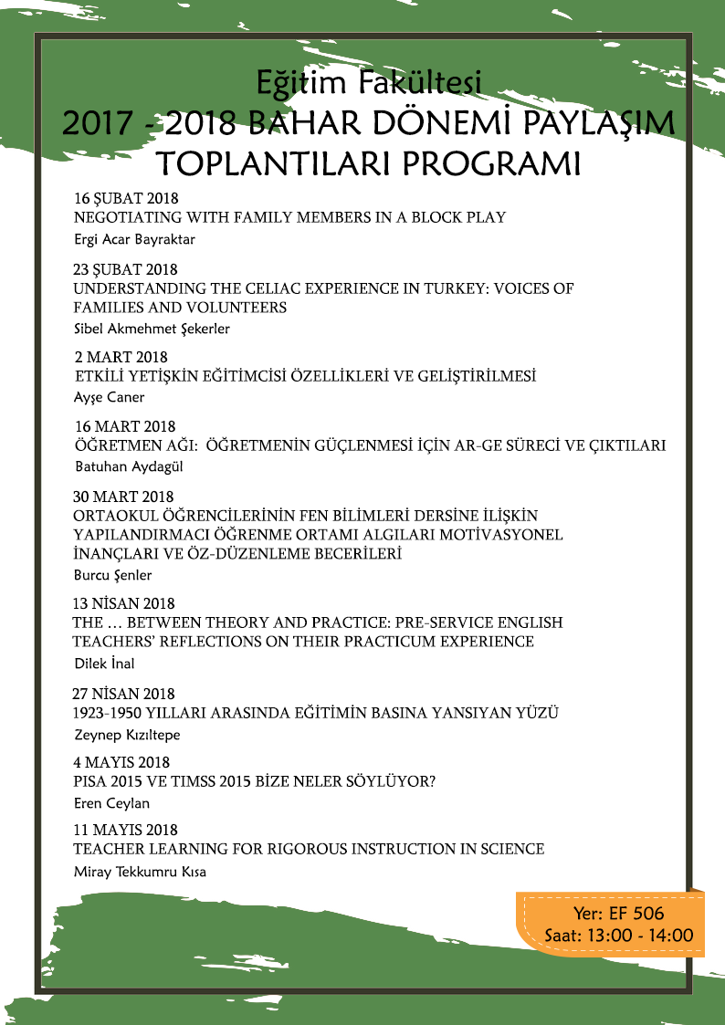 Eğitim Fakultesi 2017-2018 Bahar Paylaşım Toplantıları'nın posterine ulaşmak için buraya tıklayın.
