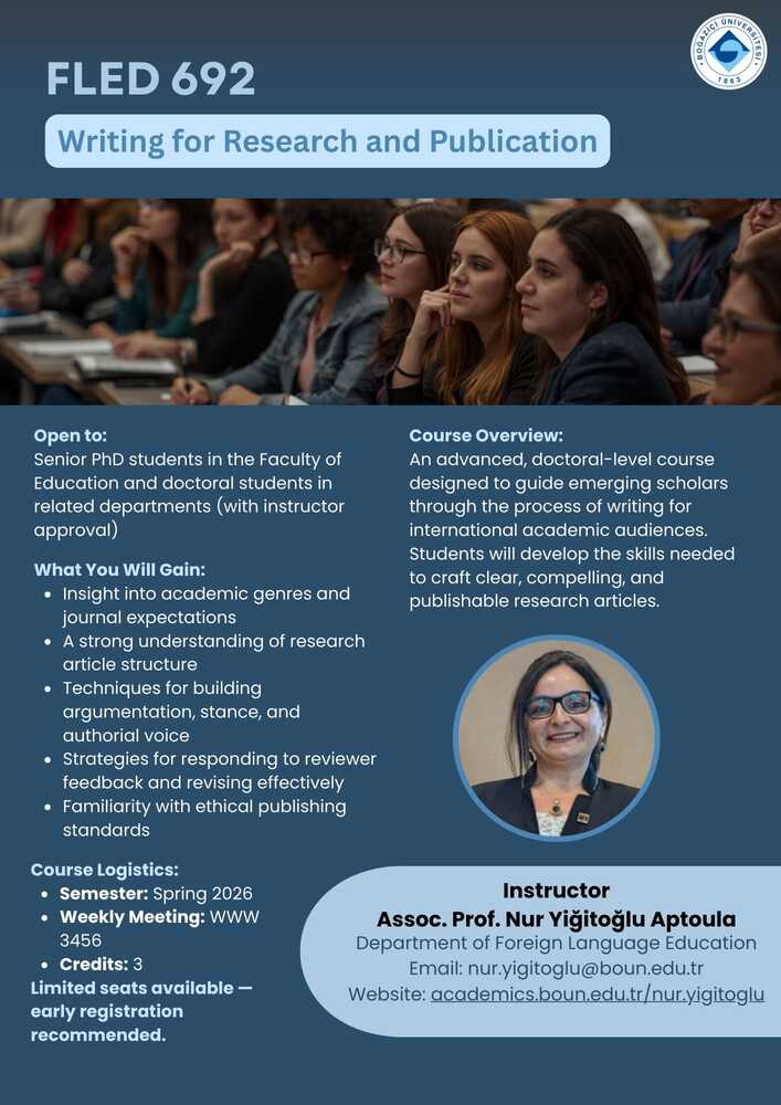 Eğitim Fakültesi bünyesinde, doktora öğrencilerine yönelik açılan FLED 692: Writing for Research and Publication dersi, uluslararası akademik dergiler için araştırma makalesi yazım sürecini desteklemeyi amaçlayan ileri düzey bir derstir. Ders kapsamında öğrenciler akademik türler ve dergi beklentileri, araştırma makalesi yapısı, akademik duruş (stance) ve yazar sesi geliştirme, hakem geri bildirimlerine yanıt verme ve etkili revizyon stratejileri ile etik yayıncılık ilkeleri üzerine çalışacaklardır.