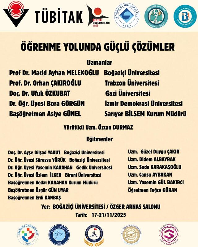4008 – Özel Gereksinimli Bireylere Yönelik Kapsayıcı Destek Uygulamaları çağrısı kapsamında desteklenen “Öğrenme Yolunda Güçlü Çözümler” başlıklı projede, Boğaziçi Üniversitesi Eğitim Bilimleri Bölüm Başkanı Prof. Dr. Macid Ayhan Melekoğlu'nun proje uzmanı, Doç. Dr. Ayşe Dilşad Yakut ve Dr. Öğr. Üyesi Süreyya Yörük'ün eğitmen olarak yürüteceği etkinlikler, 17-21 Kasım 2025 tarihinde Boğaziçi Üniversitesi Özger Arnas Salonu’nda gerçekleştirilecektir.